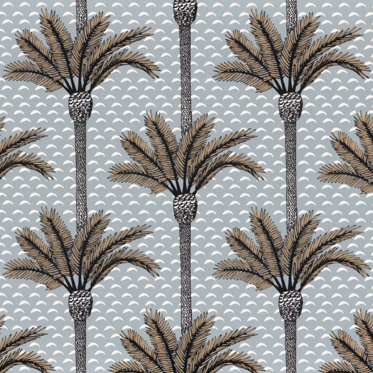 Atlas behang. Palmbomen in regelmatige kleurschakeringen structureren het vegetale thema van de achtergrond in de Map book van het Casamance huis. Deze planten steken af tegen een tweekleurige ondergrond die bestaat uit kleine lichtgolven. Deze prachtig getinte bloemenconfiguratie geeft een buitengewone toets aan de leefruimten.