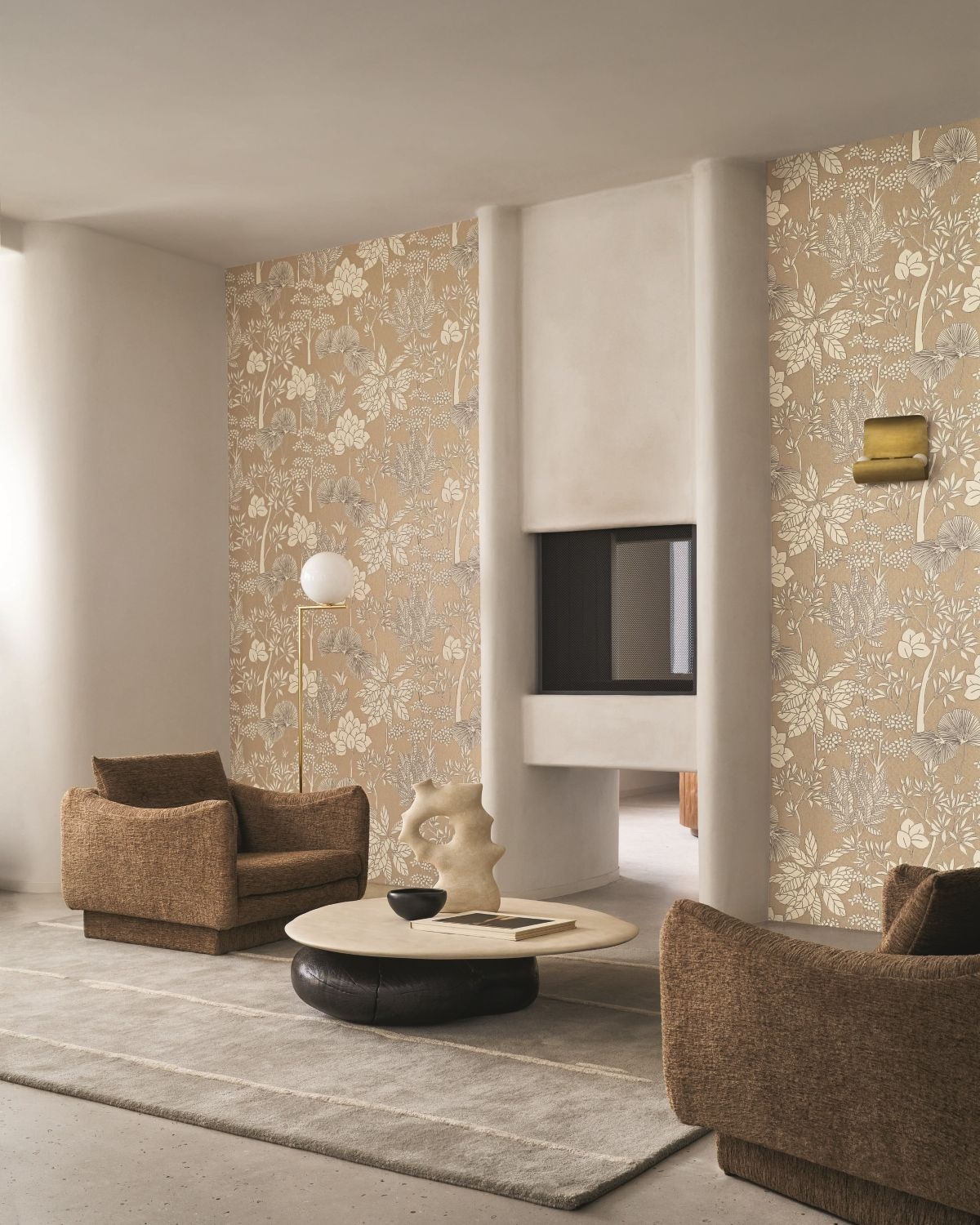 Dit behang is ideaal voor interieurs met een warme, natuurlijke of retro-uitstraling, zoals sfeervolle woonkamers, bohemien slaapkamers of stijlvolle eetruimtes.