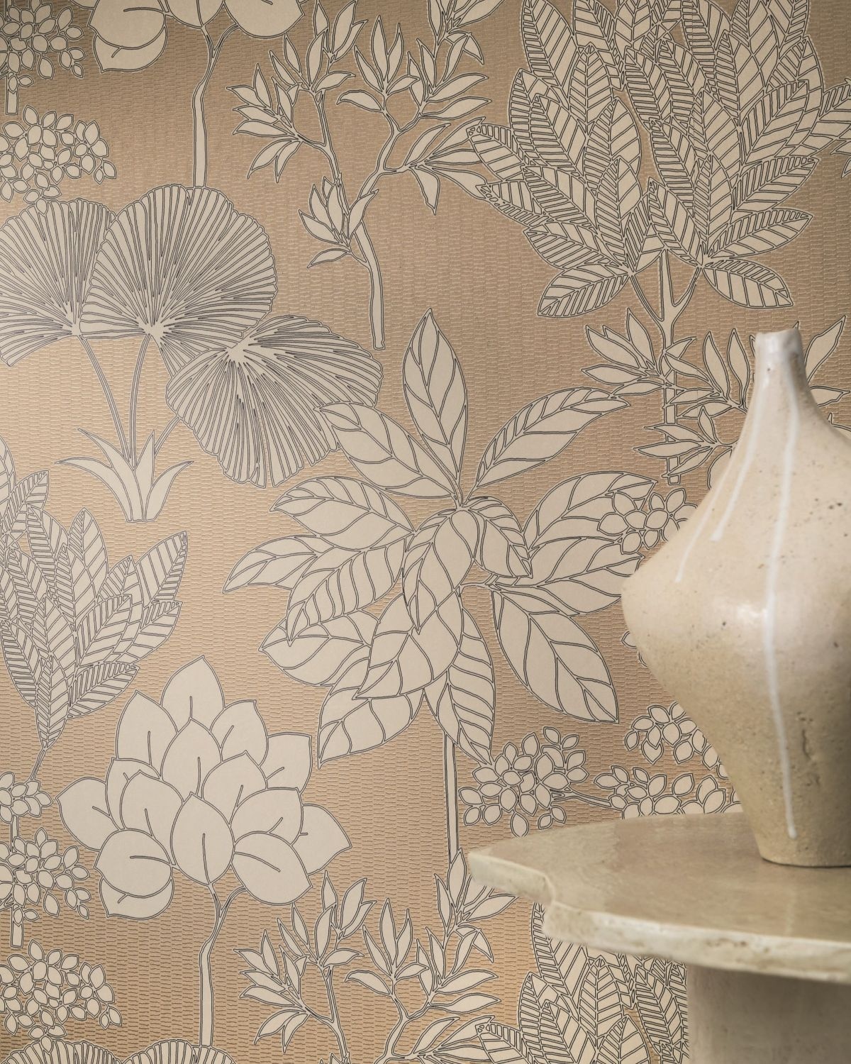 Dit behang is ideaal voor interieurs met een warme, natuurlijke of retro-uitstraling, zoals sfeervolle woonkamers, bohemien slaapkamers of stijlvolle eetruimtes.