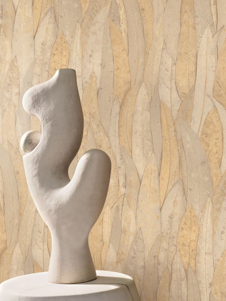 De collecte Nature Précieuse is gebaseerd op een innovatieve techniek waarbij een metallic folie op het reliëf van de textuur wordt aangebracht. In een perfecte symbiose smelten de plantafdruk en het goud in elkaar en bieden ze je interieur het meest kostbare juwelenkistje.