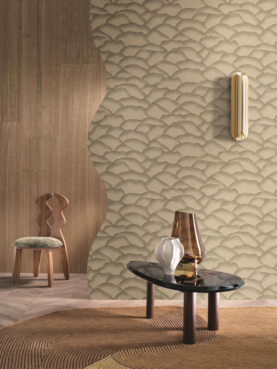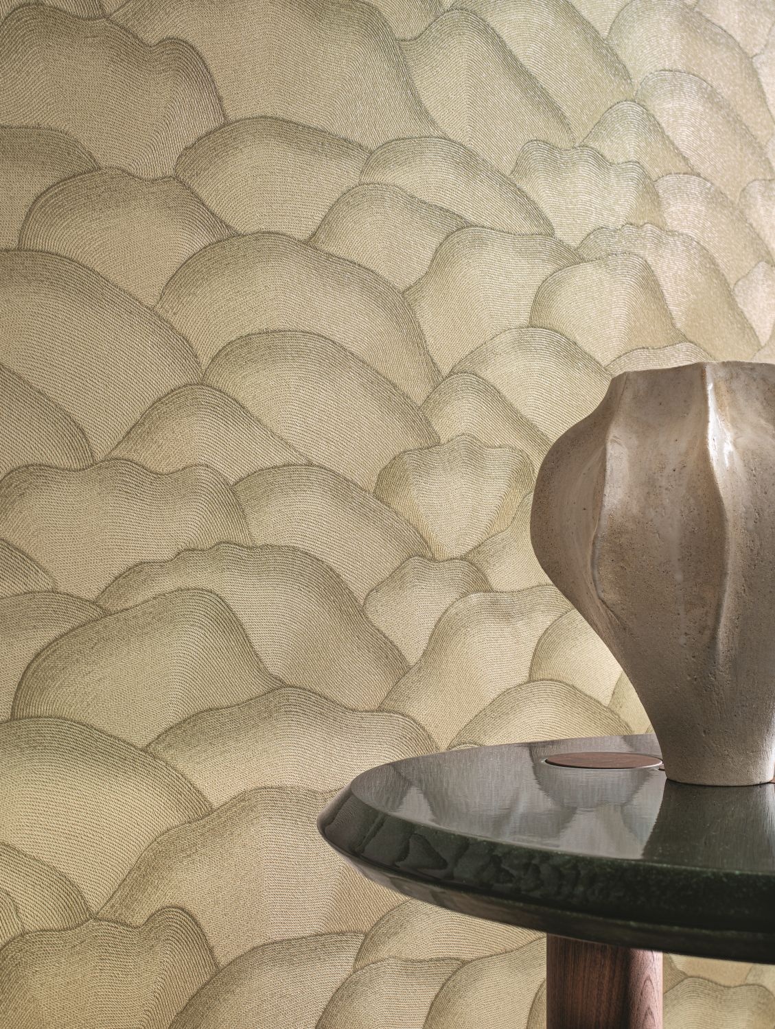 De collectie laat een reeks texturen zien die doen denken aan handwerk en borduurkunst, met een rustige uitstraling en oog voor detail. Broderies ademt rust, verfijning en natuurlijke zachtheid – perfect voor wie op zoek is naar ingetogen luxe aan de muur.