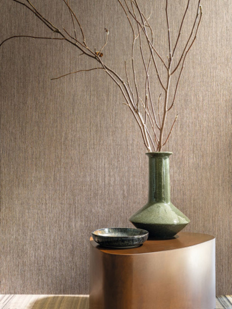 Maurelii behang. Een majestueuze bananenplant uit India, geïnspireerd op dit micropatroon, dat een afwerking heeft die doet denken aan de nerf van exotische houtsoorten.