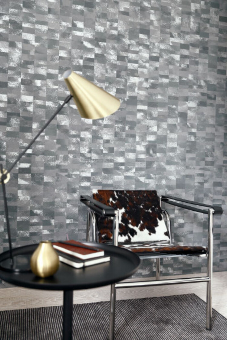 Tanko behang is een harnas gemaakt van geklonken rechthoekige platen. Ze worden op deze wandbekleding weergegeven door met de hand verlijmde vierkanten verfrommeld vloeipapier. Daarna wordt een parelmoerinkt gebruikt om oneindige nuances te creëren.