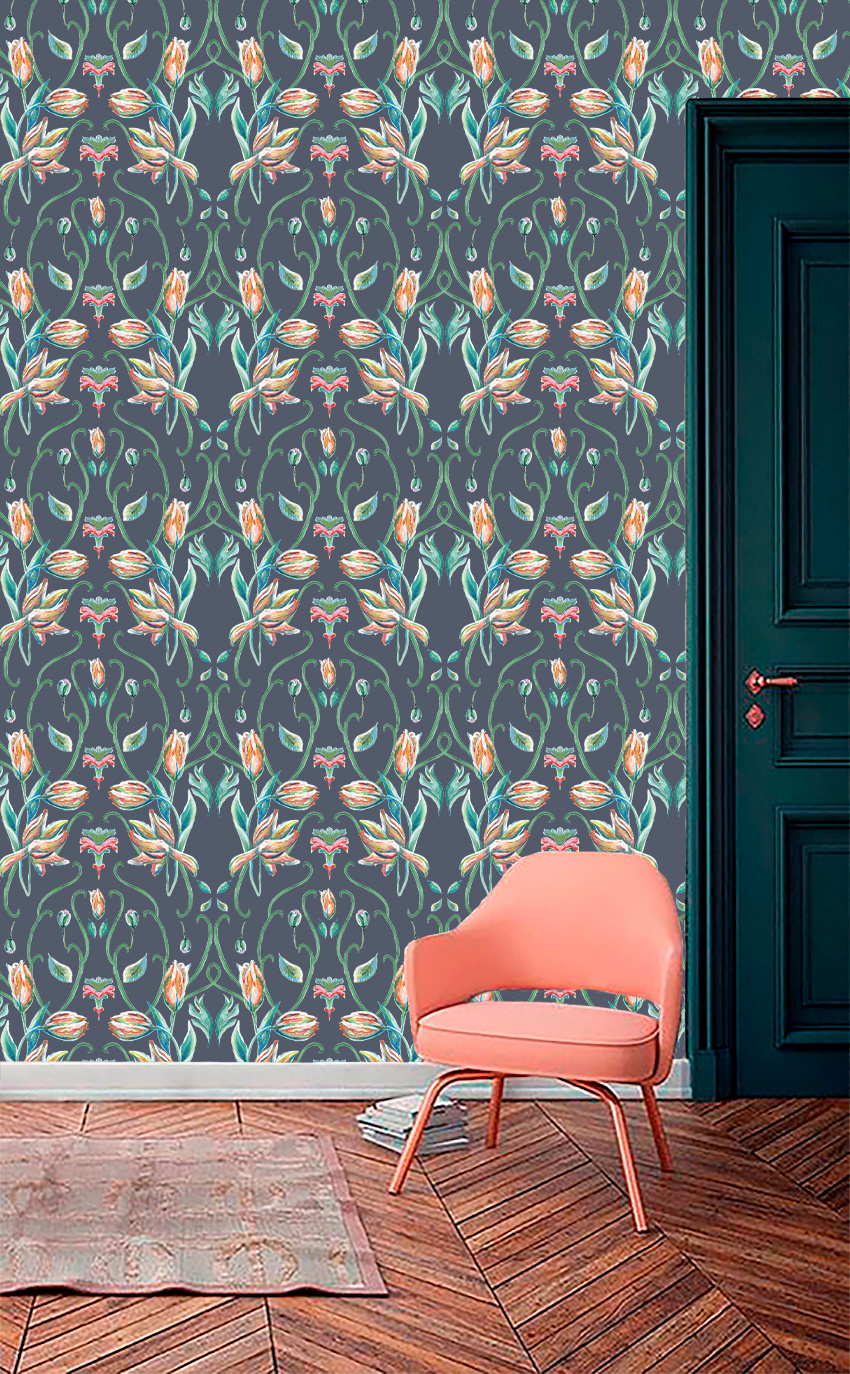 Dit delicate patroon is geïnspireerd op de kunststroming ‘Art Nouveau’ die rond 1900 ontstond in Parijs. Art Nouveau wordt gekenmerkt door het gebruik van motieven van de fascinerende flora van de wereld. De stijl is elegant en verfijnd, met organische vormen. De Franse tulp staat symbool voor lente en bloei. Laat je kamer tot leven komen.