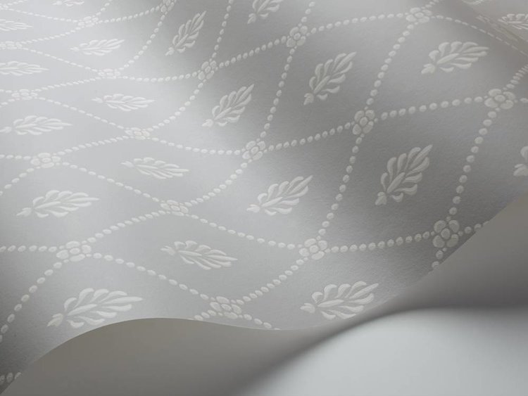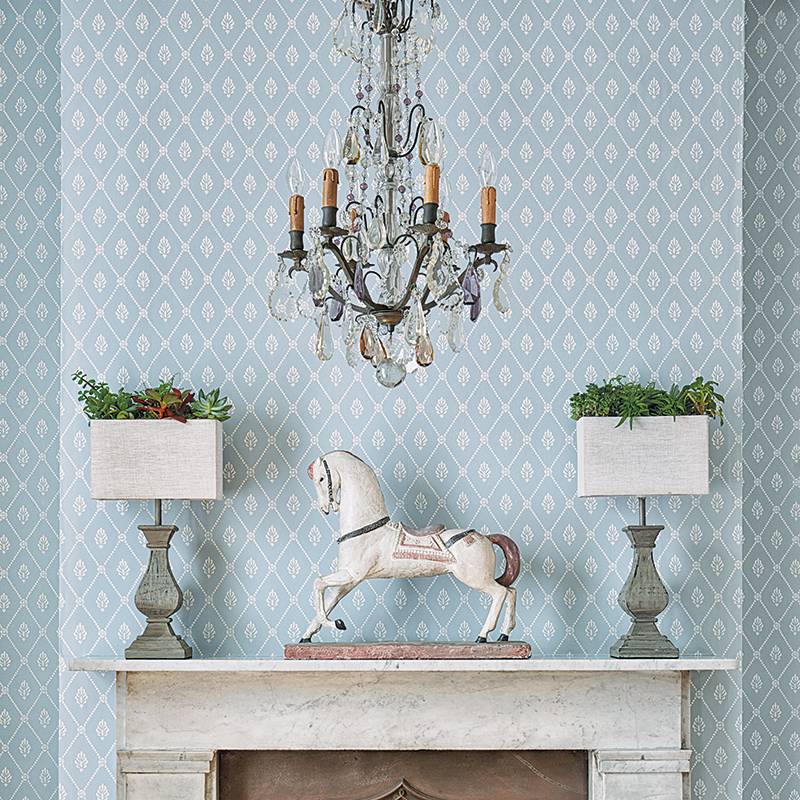 Het Alma-behang ontleent zijn titel aan de populaire Victoriaanse meisjesnaam en heeft een kleinschalig diamanten latwerk met daarin een eenvoudig takje bladmotief. Deze slimme kleine print op basis van poederblauw, grijs, zand en ecru geeft een modern gevoel aan een traditioneel motief.