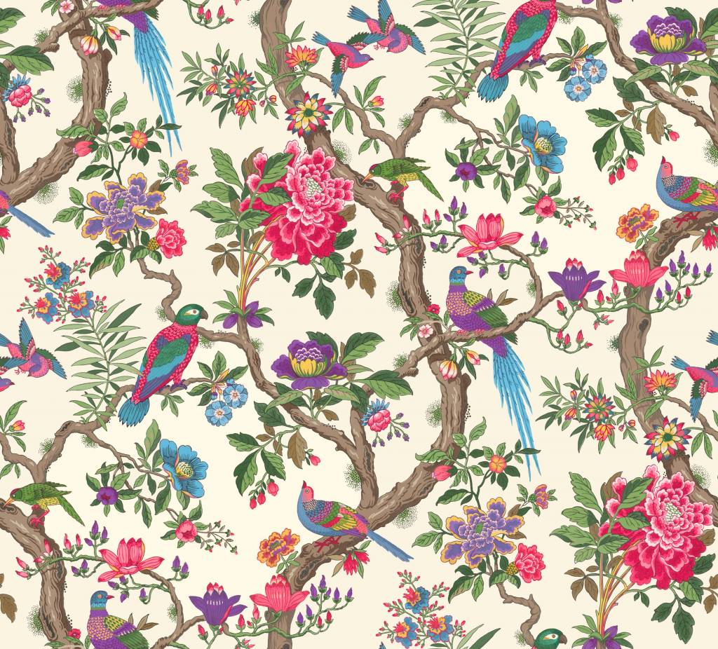 Het Cole & Son Fontainebleau behang toont een tree of life, met takken vol bloemen en vogels.