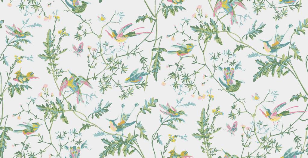 De zeer geliefde en altijd elegante, Hummingbirds, wordt gerealiseerd in een reeks van 4 nieuwe kleurenpaletten. De contrasterende veertonige Viridian, lenteachtige groen en roze en krijtachtige pastel, naast de donkere sintels van houtskool en gember, vormen allemaal een betoverende update van een van de meest duurzame ontwerpen van Cole and Son.