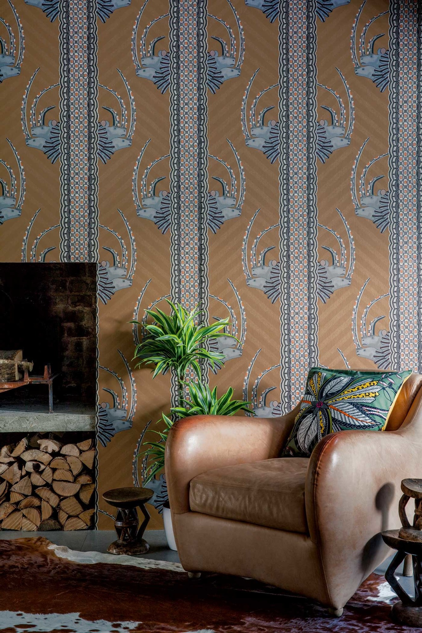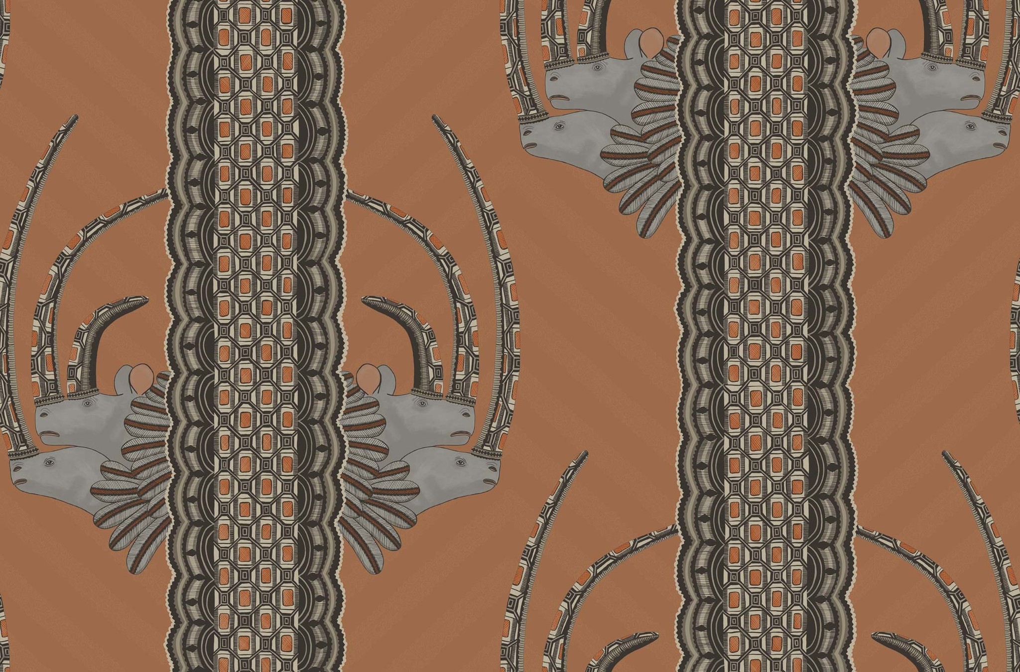 Vernoemd naar een van Ardmore's beste ontwerpers, Jabu Nene, is dit ontwerp geïnspireerd op de prachtig sculpturale neushoorns met de hand opgerolde vaartuigen, gemaakt door beeldhouwer Somandla Ntshanlintshali. Deze potten zijn vervolgens ingewikkeld geverfd in oogverblindende kleuren en patronen door Jabu Nene zelf en maken nu deel uit van Ardmore's meest geliefde kenmerkende stijlen. Onze Cole and Son-kunstenaars hebben de markeringen op deze potten gebruikt om een heerlijk rijke en levendige verticale streep te creëren, waaruit een paar koninklijke witte neushoorns gluren, compleet met versierde hoorns en gevederde kemphanen. Dit behang bevat een echte Afrikaanse geest met een patroon dat doet denken aan Zulu-mandenvlechtwerk en wordt gepresenteerd in vijf opvallende kleuren, waaronder scherpe zwarte, witte en grijze neutrale tinten naast aardse olijven, tabak en een tribal marineblauw en oranje.