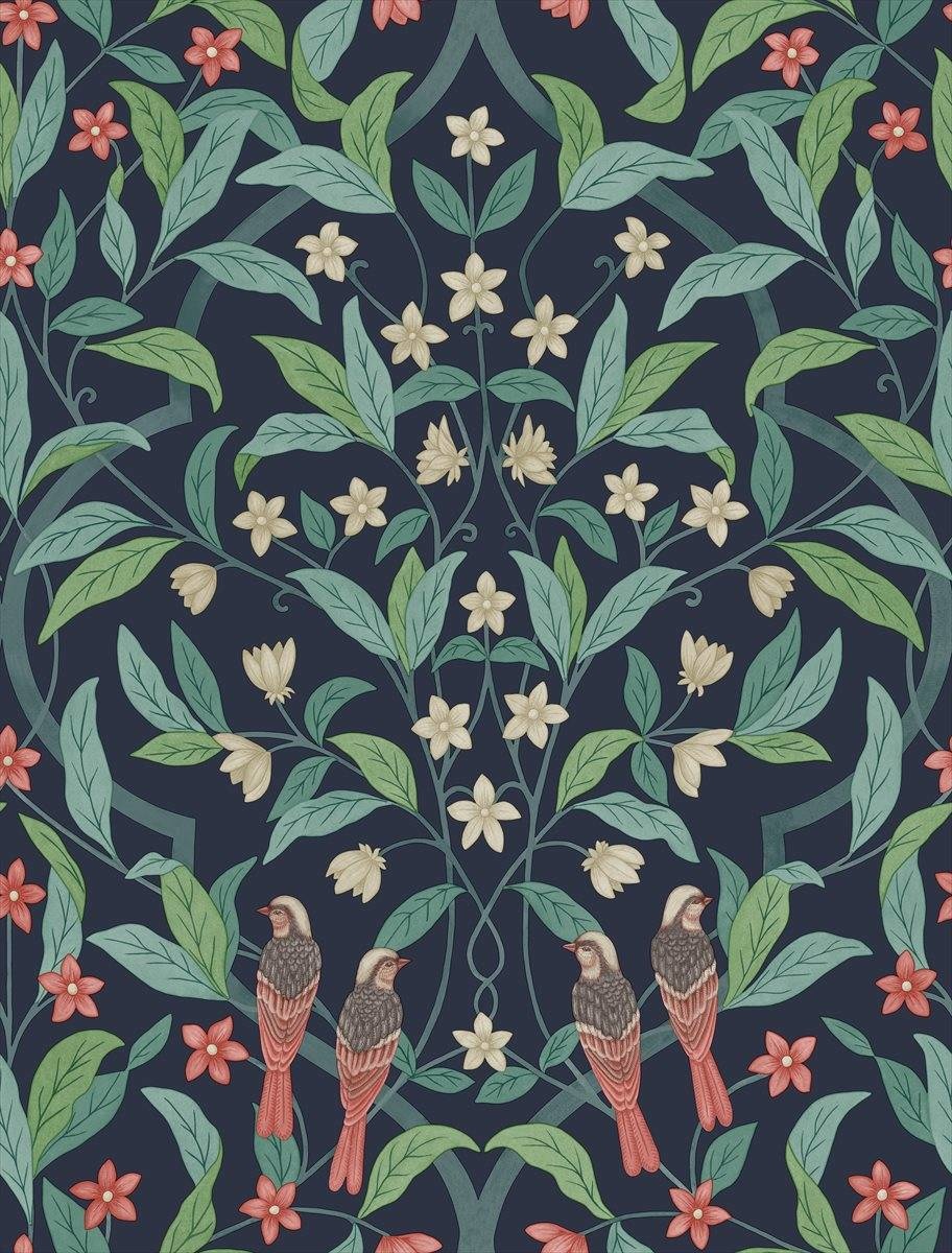 Jasmine & Serin Symphony is tegelijk uitgestrekt en sereen en is een eigentijdse update van een sierlijke print in Arts and Crafts-stijl. De flora en fauna van etherische vogels die tussen hangende jasmijnwijnstokken zitten, creëren een subtiele ombré terwijl de ontwerpfans in zachte bogen over de muur waaien.