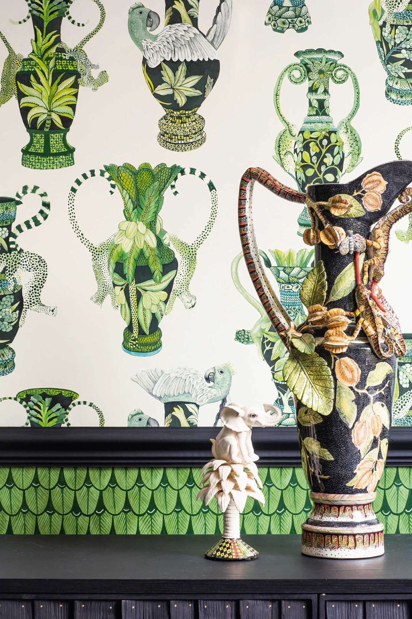 Khulu, wat 'hoofd' betekent, is een zeer toepasselijke naam voor dit grootse ontwerp van klassieke vazen verstrengeld met luipaarden, papegaaien, leeuwen en andere Afrikaanse dieren. Dit fantastische behang met zijn aquarelschilderijen is een eerbetoon aan de beroemde schepen die vandaag door veilinghuizen zoals Christie's, Bonhams en Sotherbys worden erkend als 'moderne verzamelobjecten' en tentoongesteld in galerijen en privécollecties over de hele wereld. Het ontwerp is gedrukt op een indrukwekkende herhaling van 68,5 cm en wordt aangeboden in vier kleurstellingen, waaronder zacht roze en oranje op lichte crème, veel Chinese blauw op ivoor, levendige groentinten en houtskool op ivoor en tot slot een dramatische petrol en smaragd op nachtblauw.