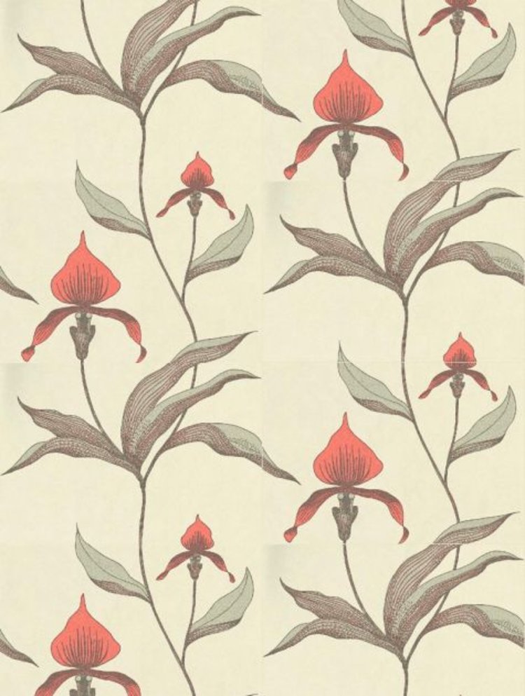 Dit grootschalige bloemenbehang heeft een opvallende orchidee die rust op stijlvolle bladeren. Verkrijgbaar in zowel gewaagde als zachtere pastelkleuren, waaronder roze en lila op steen, groen en violet op blauw, goud en zwart op diepblauw en klaproosrood op crème. Kleuren die op het scherm worden weergegeven kunnen afwijken van het originele behang, we raden daarom aan om een monster te bestellen om de ware kleuren te zien. We raden je aan om Cole & Son Tub Paste te gebruiken.