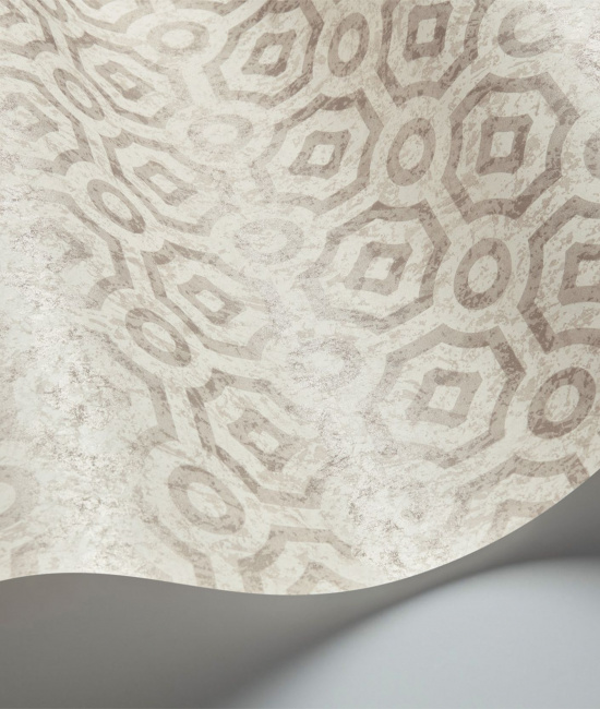 Opvallend en eigentijds, Queen's Quarter is een weelderige geometrie, ontleend aan een klein detail binnen een veel groter schema van Verrio-muurschilderingen. De onregelmatige achthoeken verschijnen als hoekvignetten in de salon van de koningin in Hampton Court Palace, waarvan de decoratie in opdracht van koningin Anne werd gemaakt als een groots statement van haar koninklijke majesteit en keizerlijke macht. De muurschilderingen als geheel zijn ontworpen om de illusie te wekken van een marmeren hal die openstaat naar de hemel, waarbij de muren zijn geschilderd om eruit te zien als tapijten met brede bloemenranden en gouden franjes. Het is echter het gepolijste metaal van Queen's Quarter dat het creatieve team van Cole & Son trof, de ingetogen herhaling en het elegante detail onthulden een verborgen juweeltje binnen het veel grotere traditionele schema.