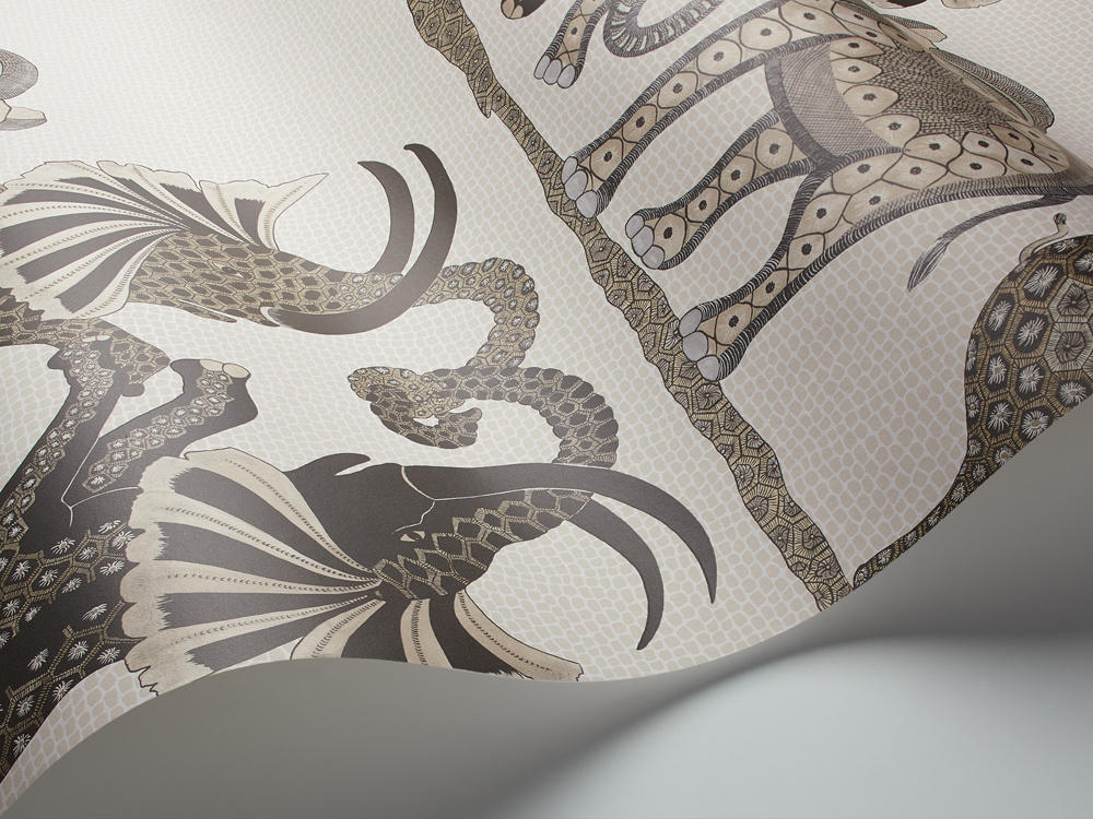 Dit behang met een prachtig patroon toont drie olifanten die horizontaal dansen over de Afrikaanse vlakten. Ze zijn ingewikkeld weergegeven en komen uit een reeks grote sierlijke urnen, geschilderd door Zinhle Nene, die een prominente plaats innemen in het Ardmore Museum. De kleuring is vrij eenvoudig gehouden om te pronken met de fijne handgetekende elementen - houtskool, zand en steen creëren een zacht gespikkelde achtergrond van zwart en wit, zachte moerbeiboom en roest, en koel krijtachtig grijs.