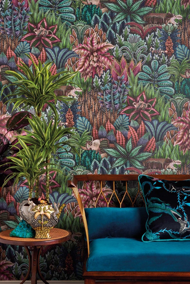 Singita, wat 'Place of Miracles' betekent, is echt precies dat! Dit rijke en fabelachtige bosontwerp is zorgvuldig en charmant met de hand geschilderd met behulp van de decoratieve plantmotieven en bladeren die de geschilderde schalen en kommen sieren die door de jaren heen door Ardmore-kunstenaars zijn gemaakt. Dit rijke tapijtachtige papier met zijn glimp van de kunstenaar, de raadselachtige dierenreizigers van Alex Sibande die door het kreupelhout slenteren, zal een luxueuze achtergrond creëren voor elk interieur.