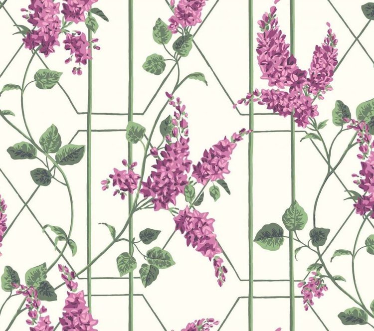 Het klimpad van Wisteria floribunda is te vinden in het archief van Cole & Son. Deze bladverliezende, zonminnende zomerbloeier met zijn glanzende trossen is bijgewerkt met een hangend handgetekend latwerk om een grafische print te creëren die net zo goed past in een cottage-tuin als in een eigentijdse omgeving. Sur-flex gedrukt, heeft Wisteria een dikke, kalkachtige textuur die elke individuele knop naar voren brengt in paletten van Coral & Sage op perkament, Magenta & Leaf Green op White, Stone & Olive op Duck Egg, Powder Blue & Jade op Cerulean Sky, en salie op bladgroen.