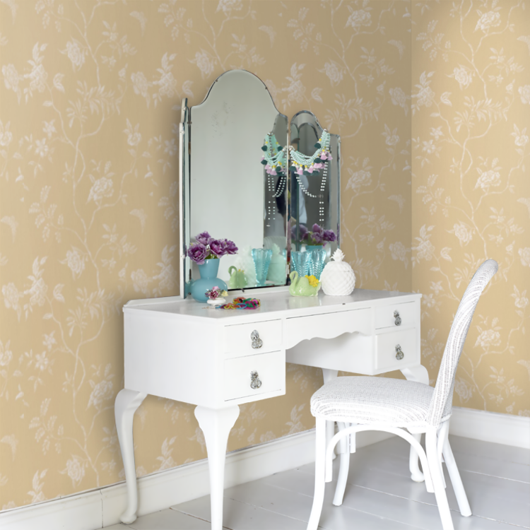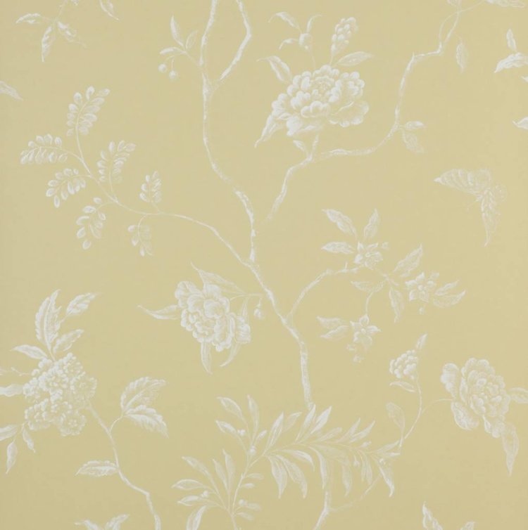 De individualiteit van de hand van de kunstenaar brengt een groot karakter aan dit delicate monotone spoor. Een vleugje Chinoiserie doet denken aan met de hand geschilderde muurbekledingen. Zachte, krijtachtige hoofdkleuren creëren een delicaat maaswerk over de pastelgronden met een contrast gecreëerd door een donkerblauwe grond.