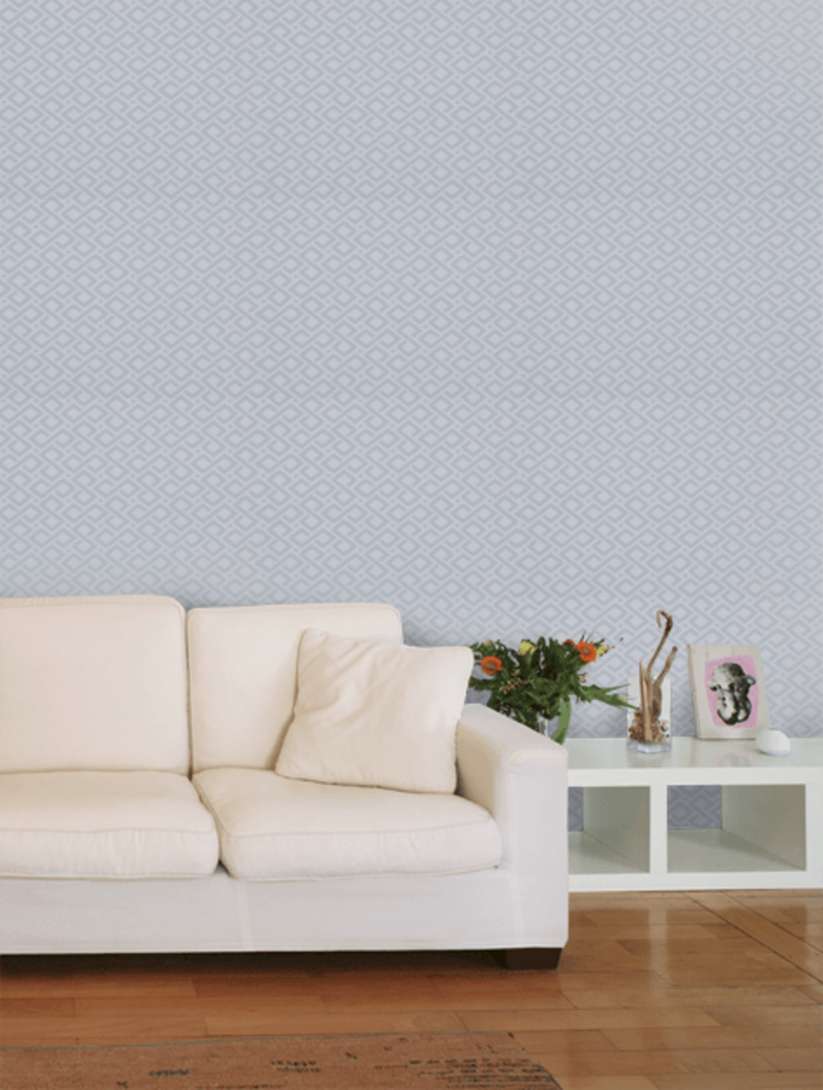 Een Grieks sleutelmotief met een gekartelde rand in een doolhofeffectpatroon. Verkrijgbaar in een reeks kleuren, weergegeven in het zachte groen op off-white