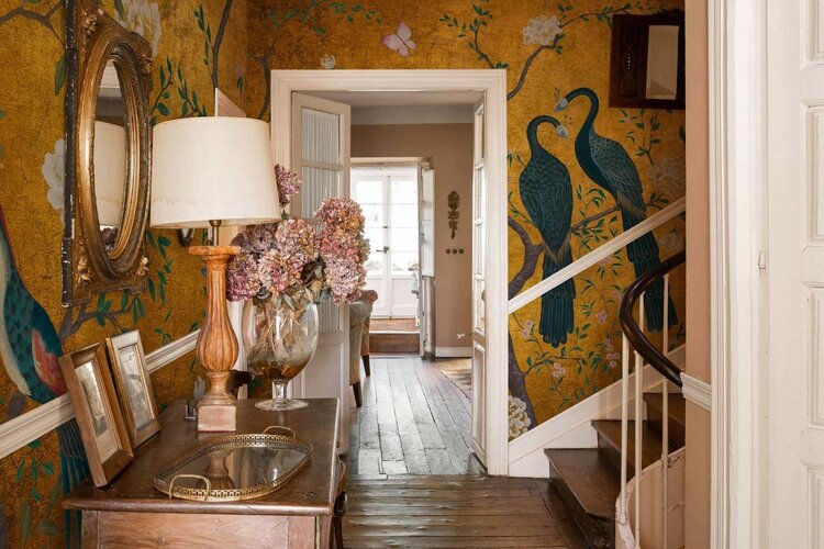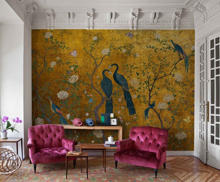 Het Coordonné Edo Gold chinoiserie behang is een botanisch behang met prachtige bloemen en takken waar sierlijke vogels hun weg in vinden. Door de mooie volle kleuren en de sierlijke vormgeving straalt dit paneel stijl en luxe uit.