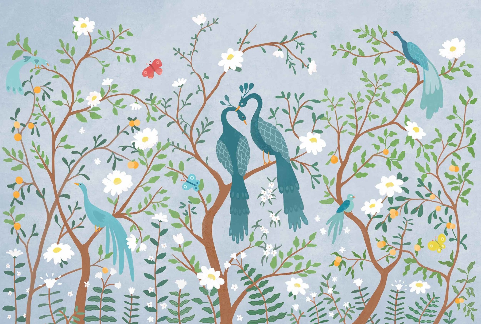 Het Coordonné Edo Kids Aqua is een cartoon versie van het bekende Edo behang van Coordonné. Dit grafische chinoiserie behang heeft een botanische print met prachtige bloemen en takken waar sierlijke vogels hun weg in vinden. Door de mooie volle kleuren en de sierlijke vormgeving straalt dit paneel stijl en blijdschap uit. Perfect om een chic en vrolijk randje toe te voegen aan de kinderkamer.