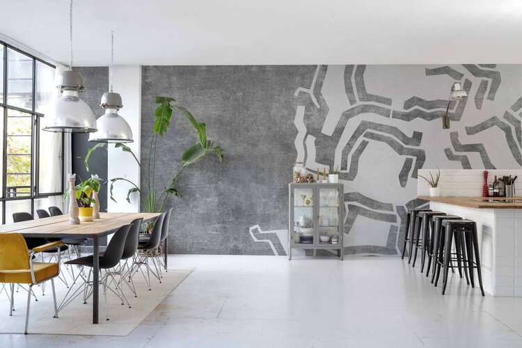 Het bijzondere Spaanse Coordonné behang is industrieel en vintage en heeft een eigen karakter.