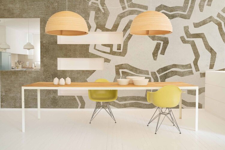 Het bijzondere Spaanse Coordonné behang is industrieel en vintage en heeft een eigen karakter.