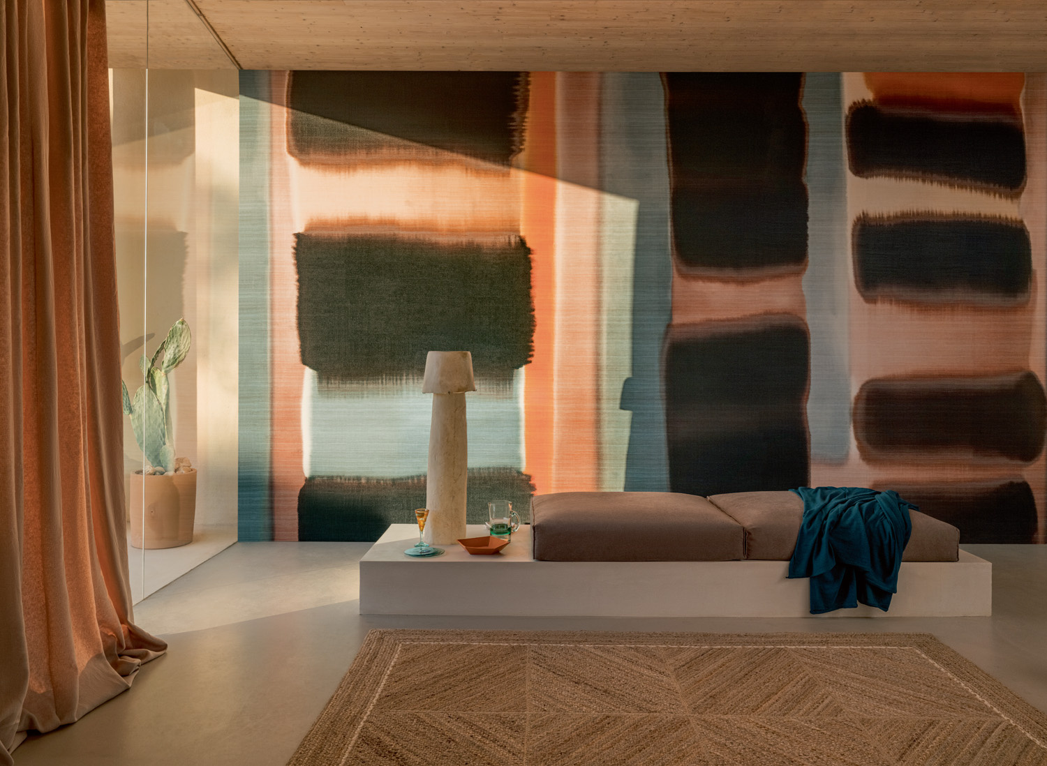 Een prachtig samenspel van Oosters textiel met abstracte kunst in betoverende kleuren. De collectie Cérès van Elitis omvat handgeweven Zuidoost Aziatische stoffen zoals Thais linnen subtiel verrijkt met abstracte prints.