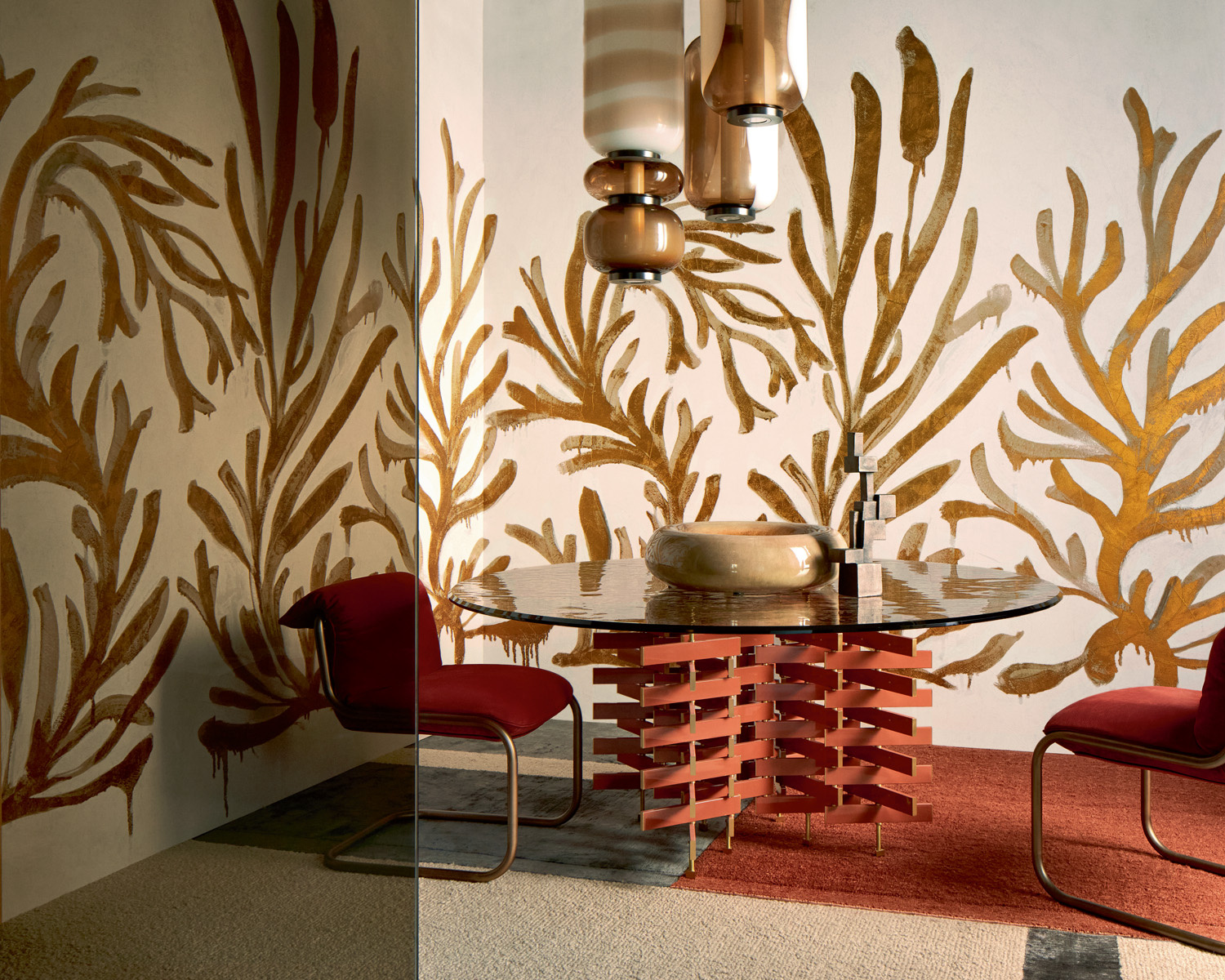 Deze collectie van Elitís brengt Kintsugi weer onder de aandacht. Kintsugi is een kunst waarbij gebroken keramiek met goud wordt gerepareerd, waardoor het nog specialer wordt. Onregelmatige, metalen lijnen lopen door de zachte kleuren heen. Wat eerst chaos lijkt, verandert in iets moois en rustgevends.