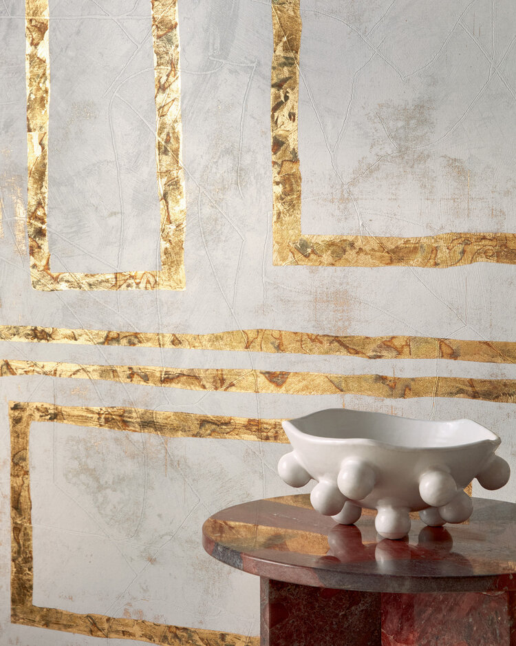 Deze collectie van Elitís brengt Kintsugi weer onder de aandacht. Kintsugi is een kunst waarbij gebroken keramiek met goud wordt gerepareerd, waardoor het nog specialer wordt. Onregelmatige, metalen lijnen lopen door de zachte kleuren heen. Wat eerst chaos lijkt, verandert in iets moois en rustgevends.