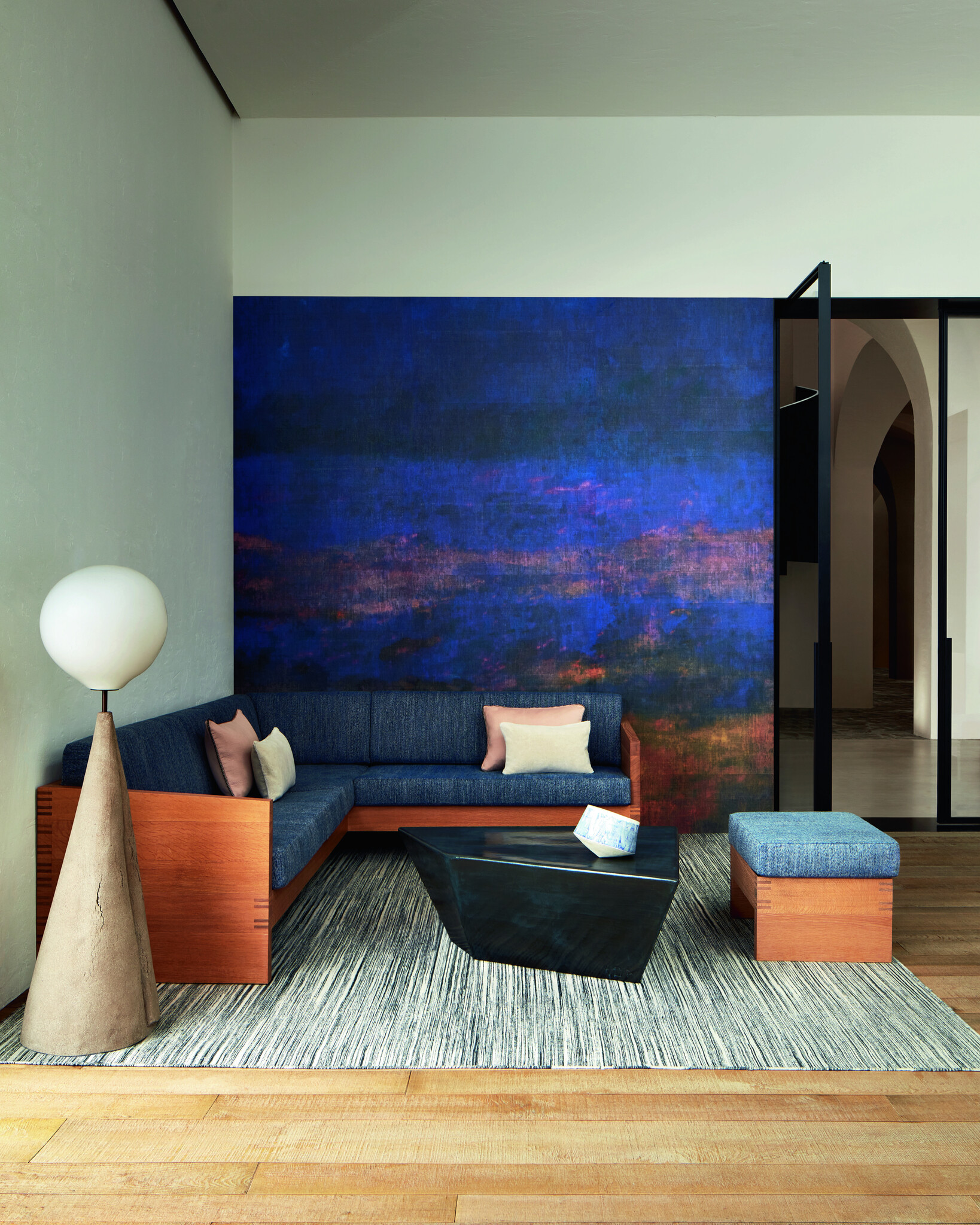 Eternité is een behang met een stoere raffia look. Deze muurbekleding van Elitis uit de Atelier d'artiste II collectie bestaat uit een dromige afbeelding, die doet denken aan het einde van een zonsondergang, vlak voordat het nacht wordt. Een artistiek paneelbehang dat perfect is voor een warm, natuurlijk en sfeervol interieur.