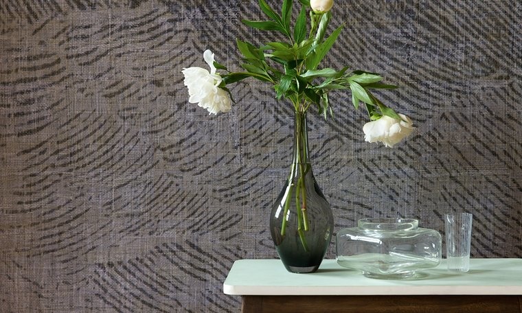 Soort: vinylbehang met een structuur van grof geweven raffia in subtiel blokmotief