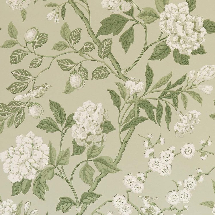 Het GP&J Baker Emperor's Garden Wallpaper is gebaseerd op een handgeschilderd Chinees behang. Het dessin is voorzien van een romantisch behang met weelderige bloemen zoals pioenrozen, maar ook kersenbloesem en paradijsvogels. Het ontwerp werd ontdekt in een herenhuis in Kent en vakkundig vertaald naar deze verbluffende nieuwe versie.