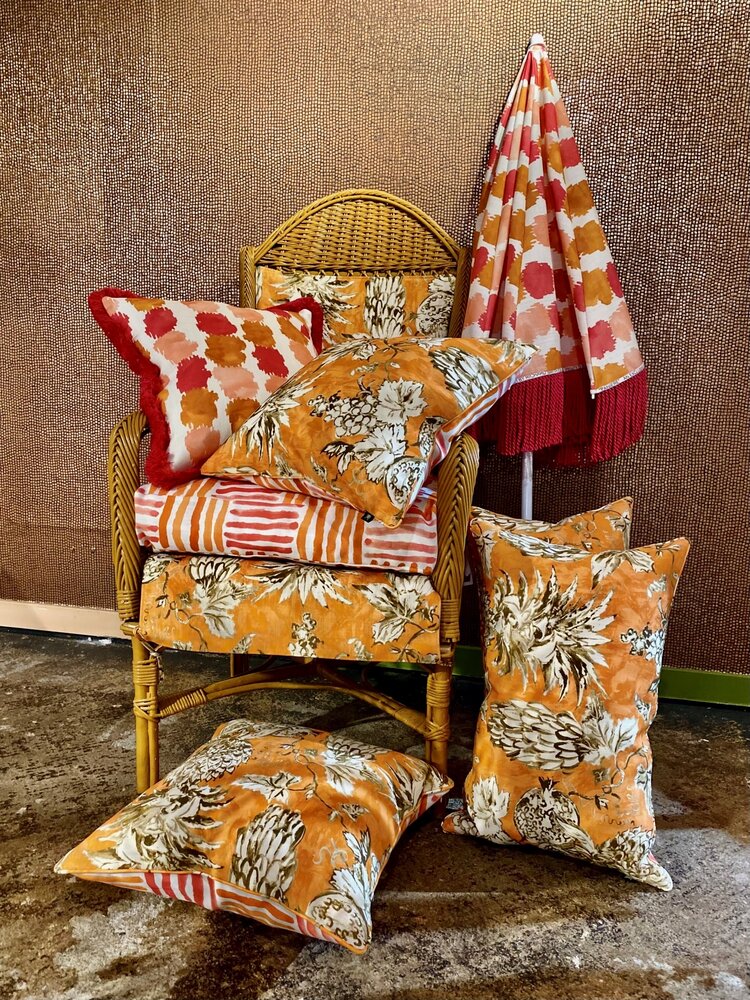 Prachtige handgemaakte kussens met outdoor stof van No. 9 Thompson, Gelataria Tutti Frutti . Het kussen is afgewerkt met een roze fringe.