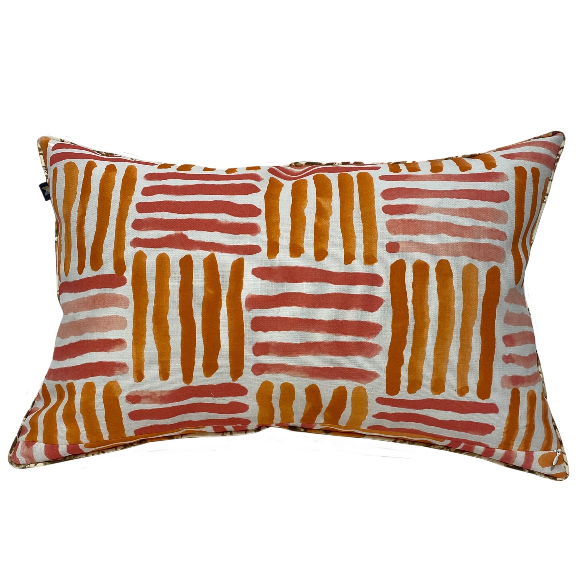 Prachtige handgemaakte kussens met outdoor stof van No. 9 Thompson. Voorzijde is bekleed met Frutteto Chocolate Orange en achterzijde met Paniere Mango Punch. Het kussen is afgewerkt met een piping en een blinde rits.