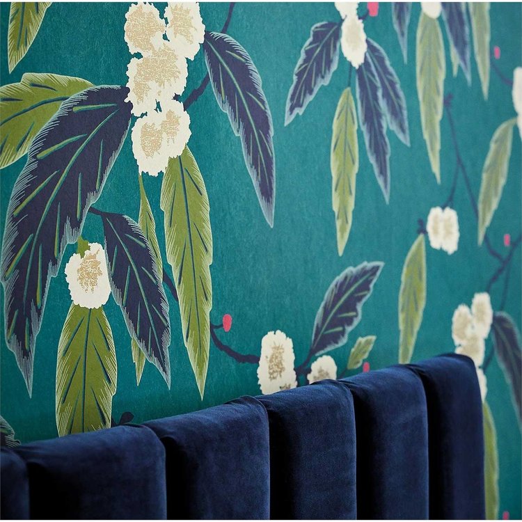 Hakhout. Geïnspireerd door een origineel archiefstuk uit de jaren 1920, is dit prachtige brede behang opnieuw gekleurd en opnieuw geverfd met metalen accenten voor het moderne huis. Verkrijgbaar in dramatische kleuren, een stof met dezelfde naam is ook beschikbaar.