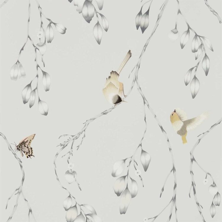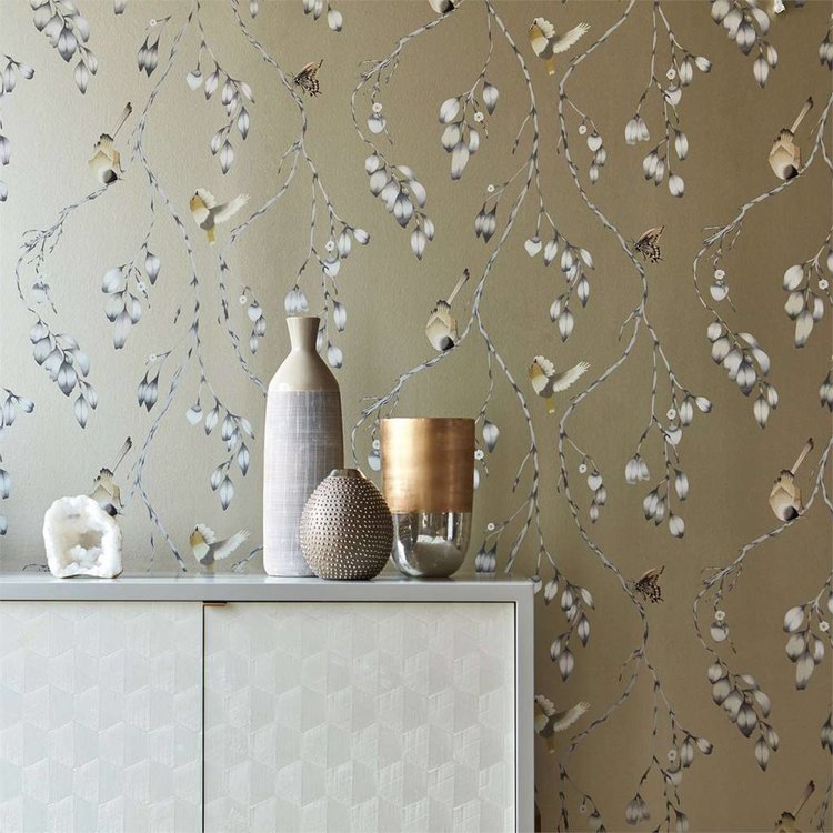 Dit delicate bladspoorbehang bevat zorgvuldig geëtste vlinders en vogels die neerstrijken op wilgachtige takken in betoverende kleuren. Een verbluffende keuze voor woonkamers.
