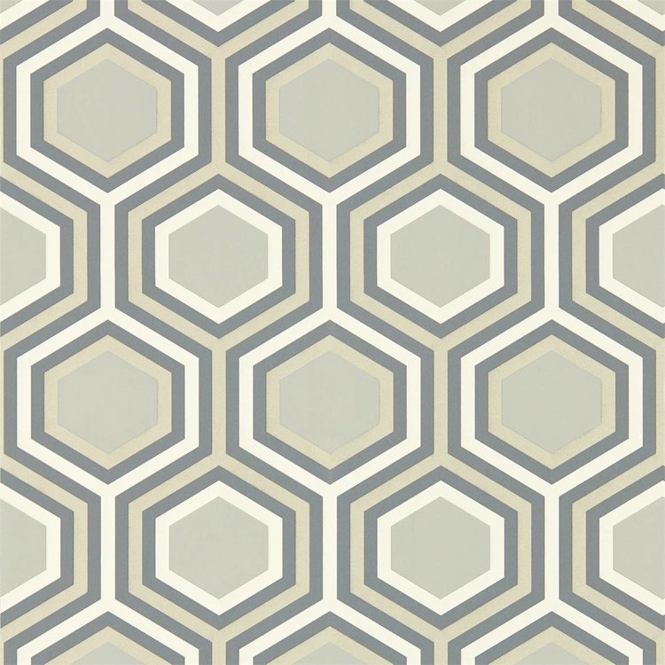 Een geometrisch behang met in elkaar grijpende zeshoeken, met een veelvoud aan metallic tinten in een reeks verbluffende kleuren.