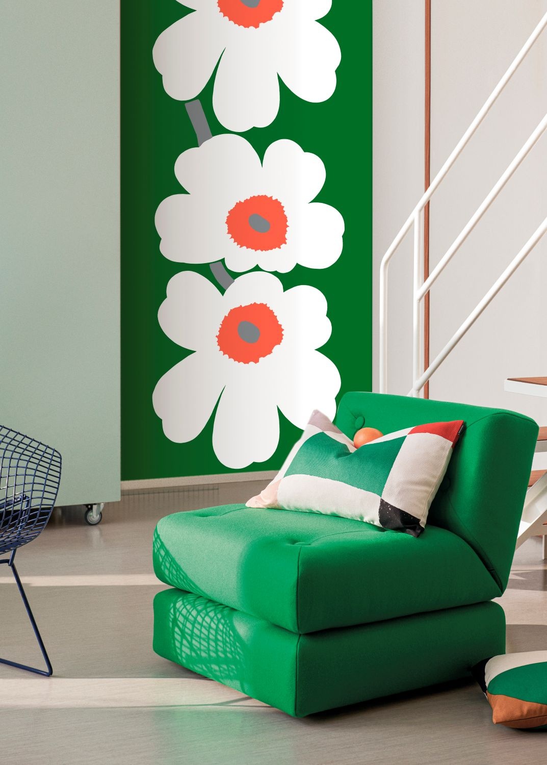 De originele Marimekko-bloem werd 60 jaar, maar is nog steeds springlevend. Ter ere van deze bijzondere mijlpaal werd deze nieuwe behangcollectie gelanceerd, vol levendige prints. De florale tekeningen zijn aangevuld met speelse grafische patronen.