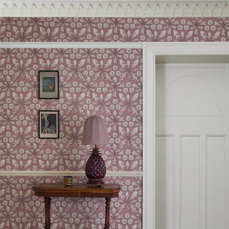 Vier de schoonheid van wilde planten met TARAXA. Dit betoverende botanische ontwerp, gebaseerd op een geometrisch archiefpatroon, beeldt de sierlijke paardenbloem uit, waarvan wordt gezegd dat hij genezing brengt en wensen meedraagt op de wind. In een kalmerende roze tint is dit behang de ideale manier om de herstellende kracht van de natuur in je interieur te brengen.