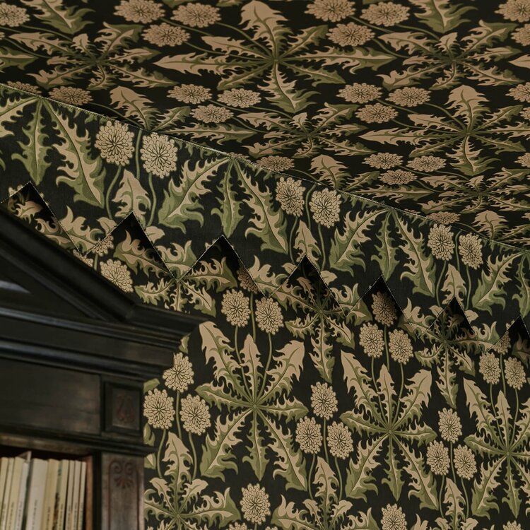 Vier de schoonheid van wilde planten met TARAXA. Dit betoverende botanische ontwerp, gebaseerd op een geometrisch archiefpatroon, beeldt de sierlijke paardenbloem uit, waarvan wordt gezegd dat hij genezing brengt en wensen meedraagt op de wind. In zachte crèmetinten en groen tegen een diep inktzwarte achtergrond, is dit behang de perfecte manier om de magie van de natuur in huis te halen.