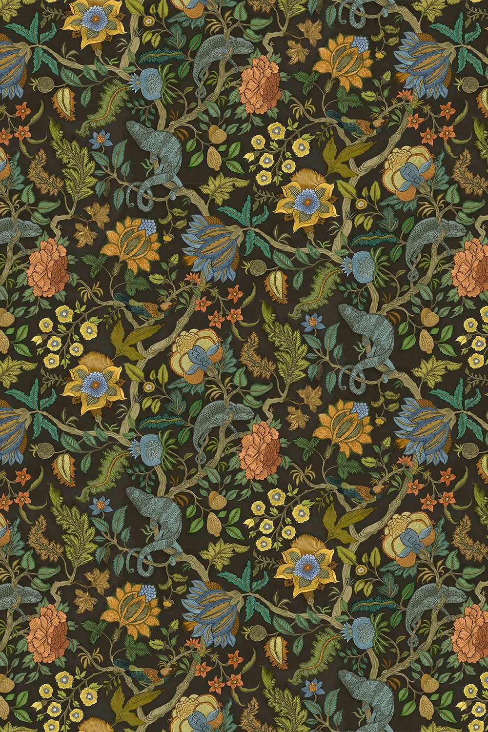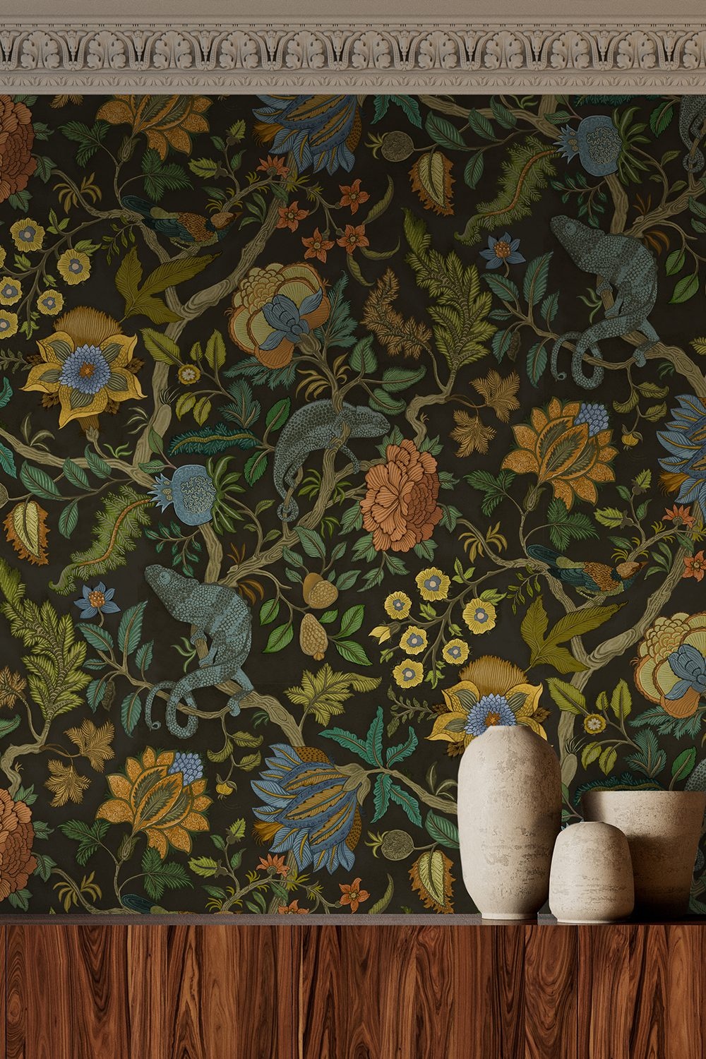 Chameleon Trail is een behang met een speels ontwerp. Deze muurbekleding van Josephine Munsey, uit de collectie Portfolio 2, toont een uitbundige levensboom met rankende takken, weelderige bloemen, kleurrijke vogels en kameleons. Een weelderig behang dat perfect is voor een botanisch en kleurrijk interieur met een knipoog.
