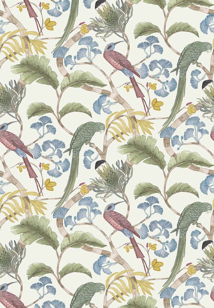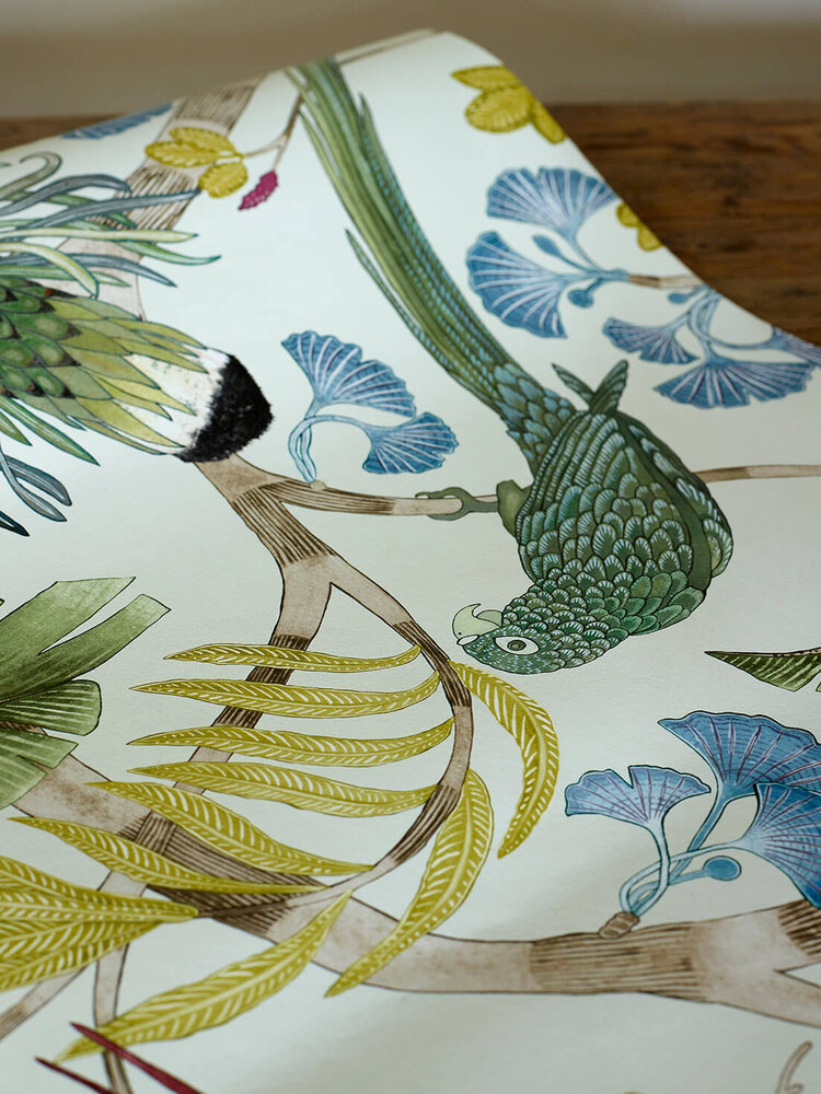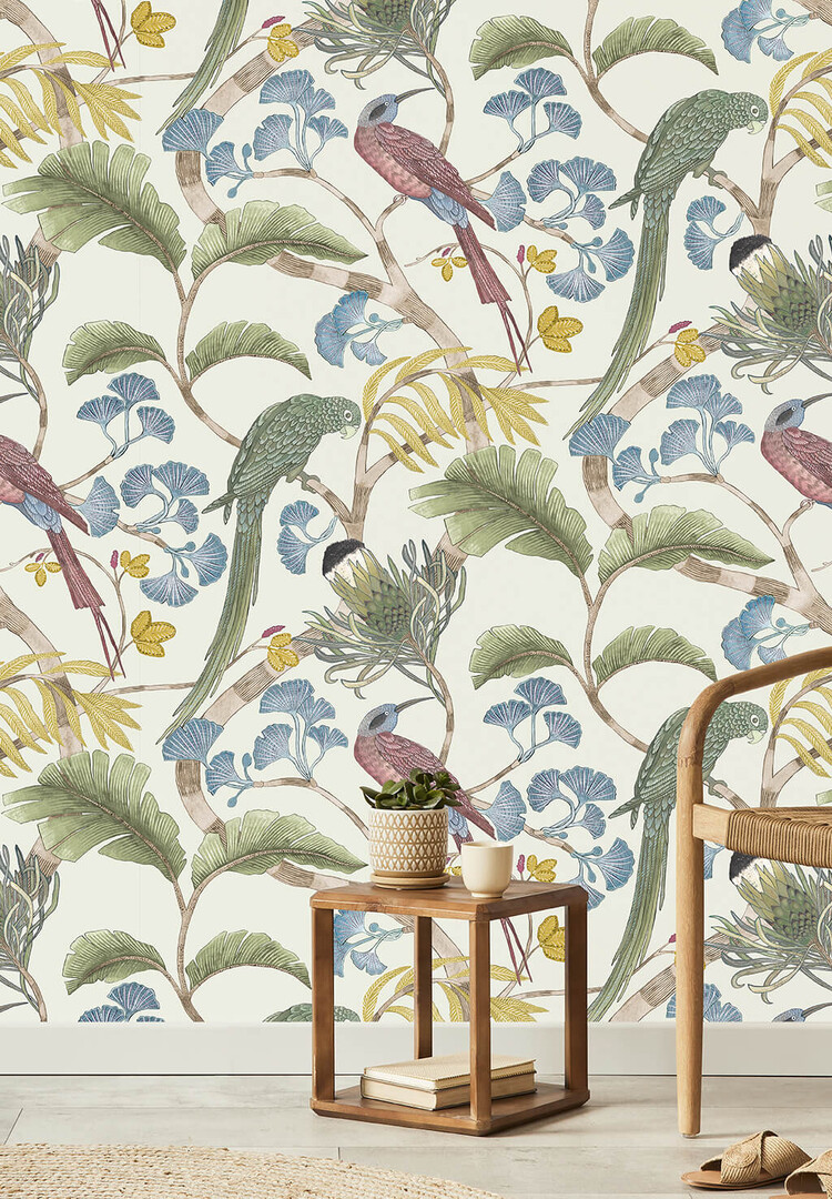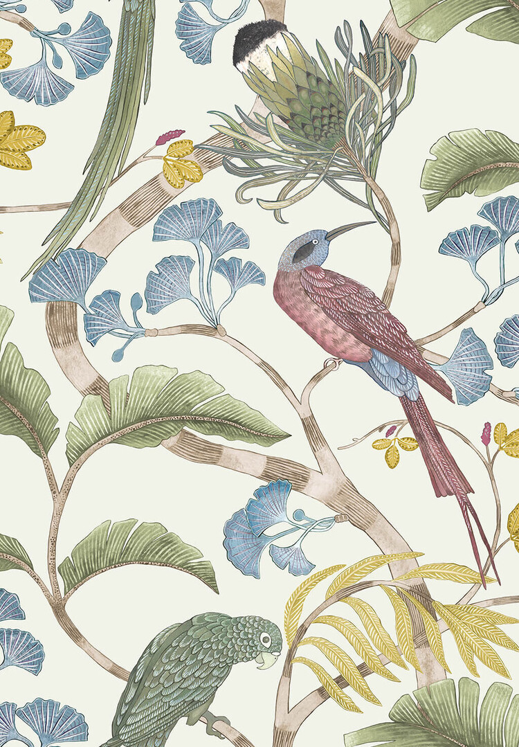 Living Branches behang toont een handgeschilderde boom met exotische flora en fauna omgeven door ginkgo bladeren en protea bloemen. Deze muurbekleding van Josephine Munsey, uit de collectie Portfolio 1, is een prachtig behang dat perfect is voor een botanische, magische en kleurrijke ruimte.
