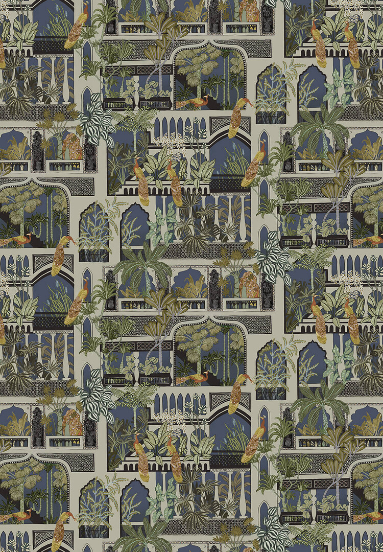 Peacock Arches is een behang dat is geïnspireerd op de Indiase architectuur. Deze muurbekleding van Josephine Munsey, uit de collectie Portfolio 1, toont architecturale deuropeningen en ramen met weelderige bladeren en prachtige pauwen. Een kleurrijk behang dat perfect is voor een poëtisch, bijzonder en uniek interieur.