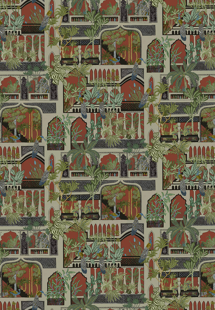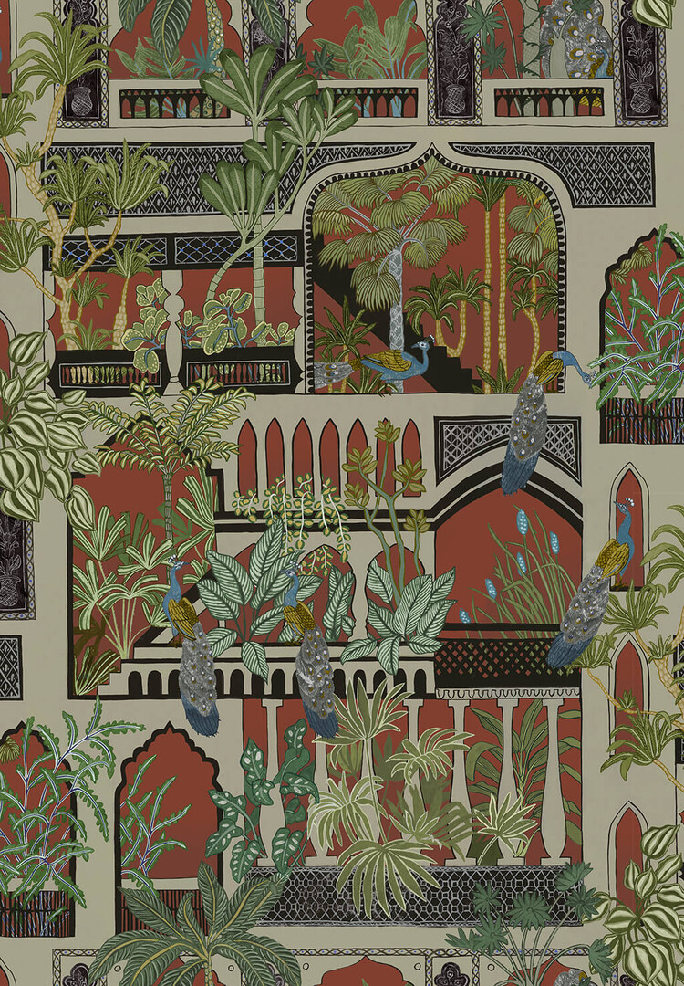 Peacock Arches is een behang dat is geïnspireerd op de Indiase architectuur. Deze muurbekleding van Josephine Munsey, uit de collectie Portfolio 1, toont architecturale deuropeningen en ramen met weelderige bladeren en prachtige pauwen. Een kleurrijk behang dat perfect is voor een poëtisch, bijzonder en uniek interieur.