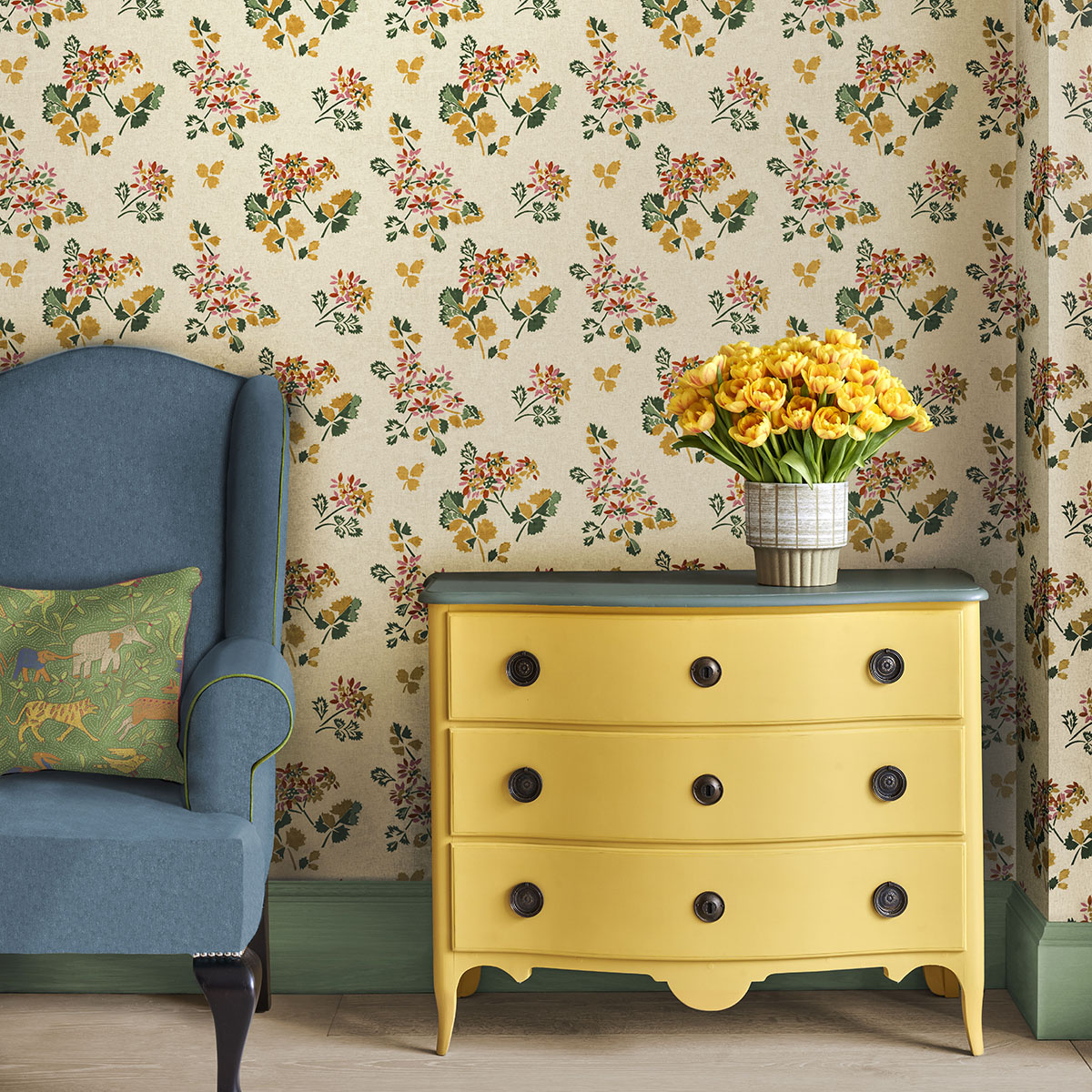 GP & J Baker x Kit Kemp Wallpapers II is een karaktervolle behangcollectie vol kleur, vakmanschap en speelse elegantie. De collectie bestaat uit zeven uitgesproken dessins en een verfijnd uni structuurbehang in 25 kleurvarianten, geïnspireerd op de warme uitstraling van luxe stofwanden.