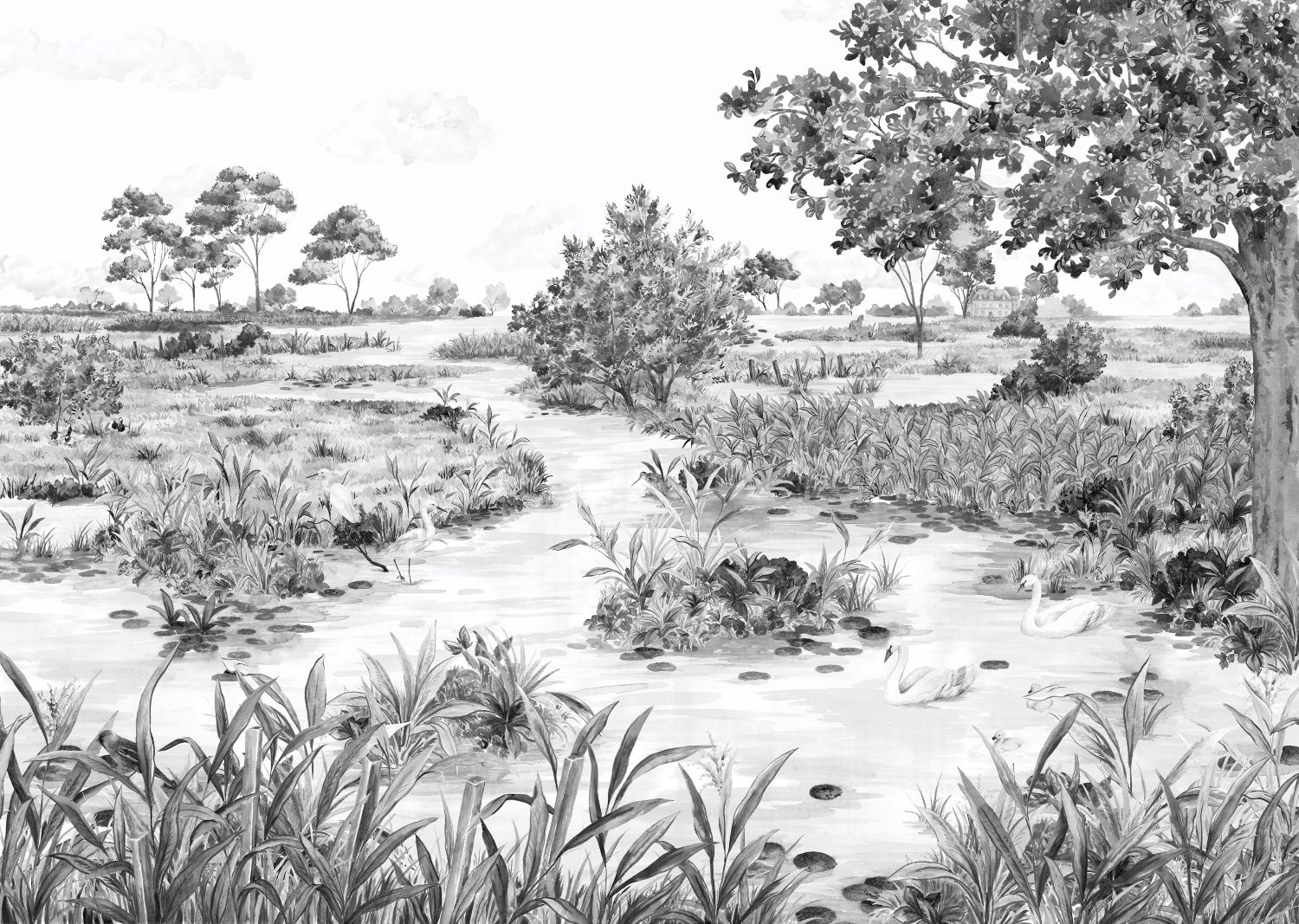 De collectie Douce France is een panoramische behangcollectie van Les Dominotiers, een Frans merk dat bekend staat om z’n stijlvolle muurschilderingen en behang op maat. Het idee: een beetje als een schetsboek dat je doorbladert na een reis — pure liefde voor de diversiteit van het Franse landschap, van kust tot bergen, van marais tot mediterrane stadjes.