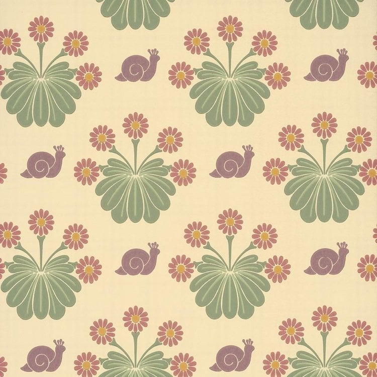 Burges Snail' (Knightshayes Court) c.1878 Knightshayes Court in Devon, gebouwd tussen 1869 en 1874, werd ontworpen voor de familie Heathcoat Amory door de neogotische architect en interieurontwerper William Burges. Als excentriek en soms controversieel personage ontwierp hij enkele van de meest originele en extravagante Victoriaanse interieurs, soms gekleed in middeleeuwse kostuums. Dit eigenzinnige, charmante behang siert de muren van een van de badkamers en hoewel het bekend staat als zijn ontwerp, werd het geïntroduceerd in een latere restauratie, na een periode van vele jaren waarin volgende generaties van de familie probeerden de uitgebreide High van het huis te minimaliseren. Victoriaanse gotische stijl.