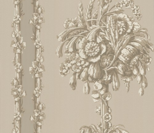 Stilistisch is dit behang onmiskenbaar Frans, maar het archiefstuk, dat niet veel veranderd hoefde te worden, komt van een prestigieus adres in de buurt van de Theems. De sierstreep aan weerszijden van de bloemenzuil is behouden, maar minder zwaar aangebracht om het patroon meer in balans te brengen bij het herhalen van rijstroken.