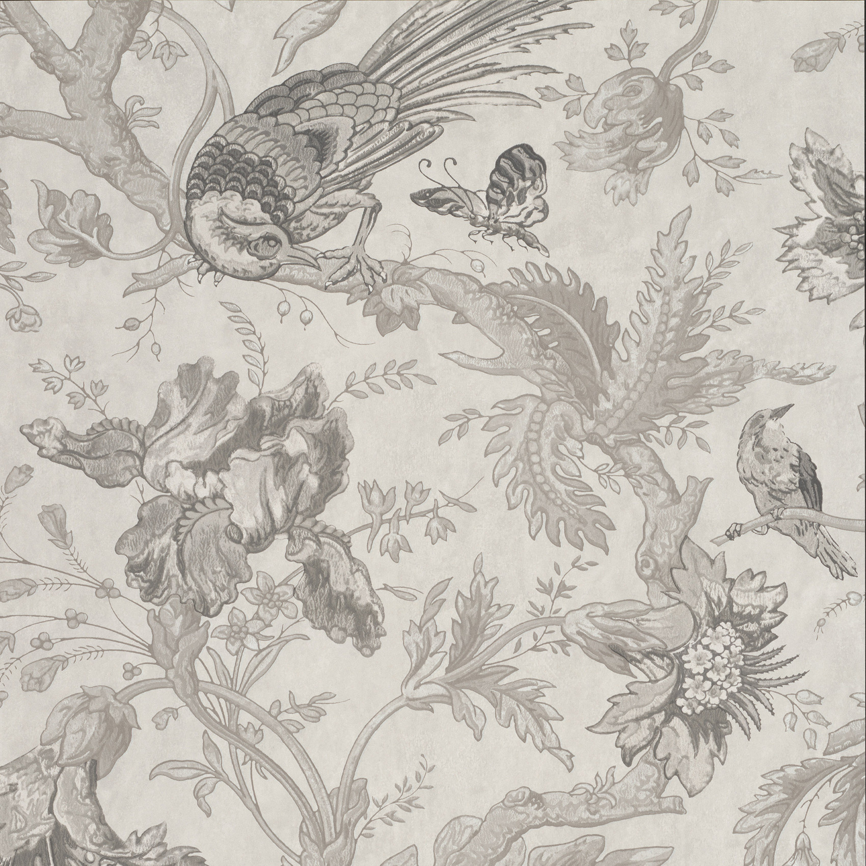 Crowe Hall Lane behang van Little Greene. Een grootschalig, laat-19e-eeuws behang met een gewaagd patroon van exotische vogels en bloemen. Het papier was gebruikt in een gebogen trappenhuis in Crowe Hall, een herenhuis in Suffolk waar het verticale karakter van het slepende patroon de hoogte van de kamer benadrukte. Het is waarschijnlijk rond de eeuwwisseling opgehangen en werd veel later teruggevonden tijdens uitgebreide conserveringswerkzaamheden aan het huis. Dit ontwerp is een bestaand en veel bewonderd onderdeel van de Little Greene-portfolio; het is verkrijgbaar in drie nieuwe kleurstellingen en vier bestaande.