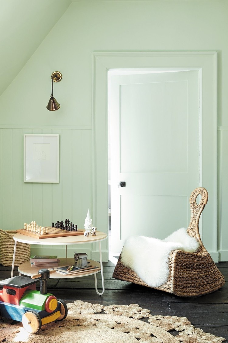 Dit is Hidey Hole: een heldere groentint. Deze verf van Little Greene is veelzijdig, neutraal en licht. De perfecte verf voor een tijdloos, sfeervol en klassiek interieur.