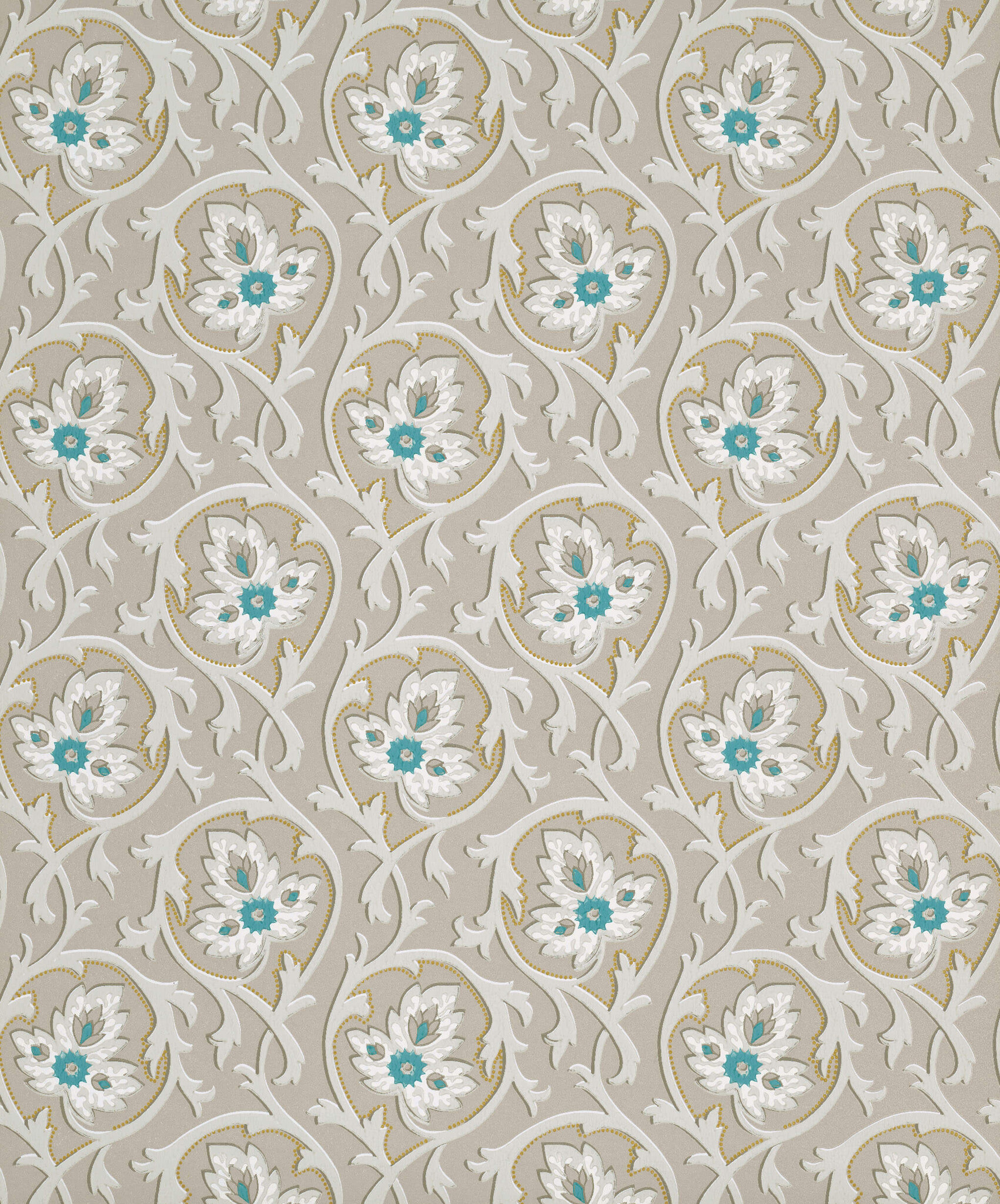 Dit klassieke bladerpatroon werd gebruikt in een van de zolderkamers van Oxburgh en het oppervlak werd bedrukt voor een traditionele, schilderachtige afwerking. Hoewel het ontwerp elementen bevat van 17de-eeuws Spaans reliëf en verguld leder, wordt aangenomen dat het dateert van het einde van de 19de-eeuw, omdat het druksubstraat machinaal bedrukt papier is.